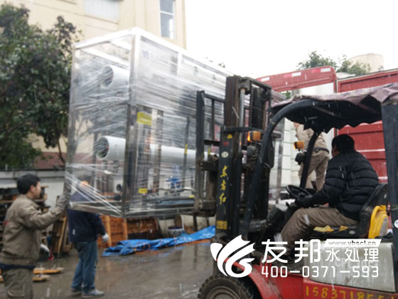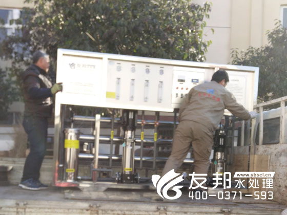 師傅們正在裝車(chē)發(fā)貨的是鄭州友邦生產(chǎn)的型號(hào)為YB-CJS-002的2噸純凈水設(shè)備。這套設(shè)備是用在鄭州高新區(qū)機(jī)械廠的生產(chǎn)用水。